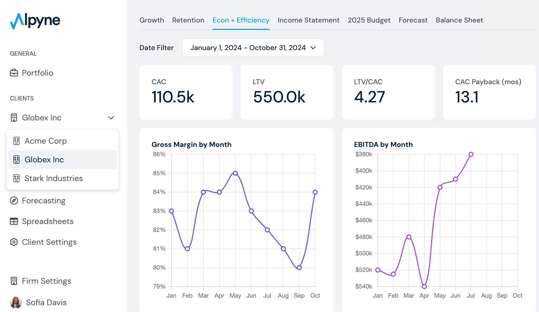 Alpyne connects all your clients’ systems, standardizes their data, and gives you real-time dashboards, forecasting, spreadsheet sync, and an AI-powered financial analyst.