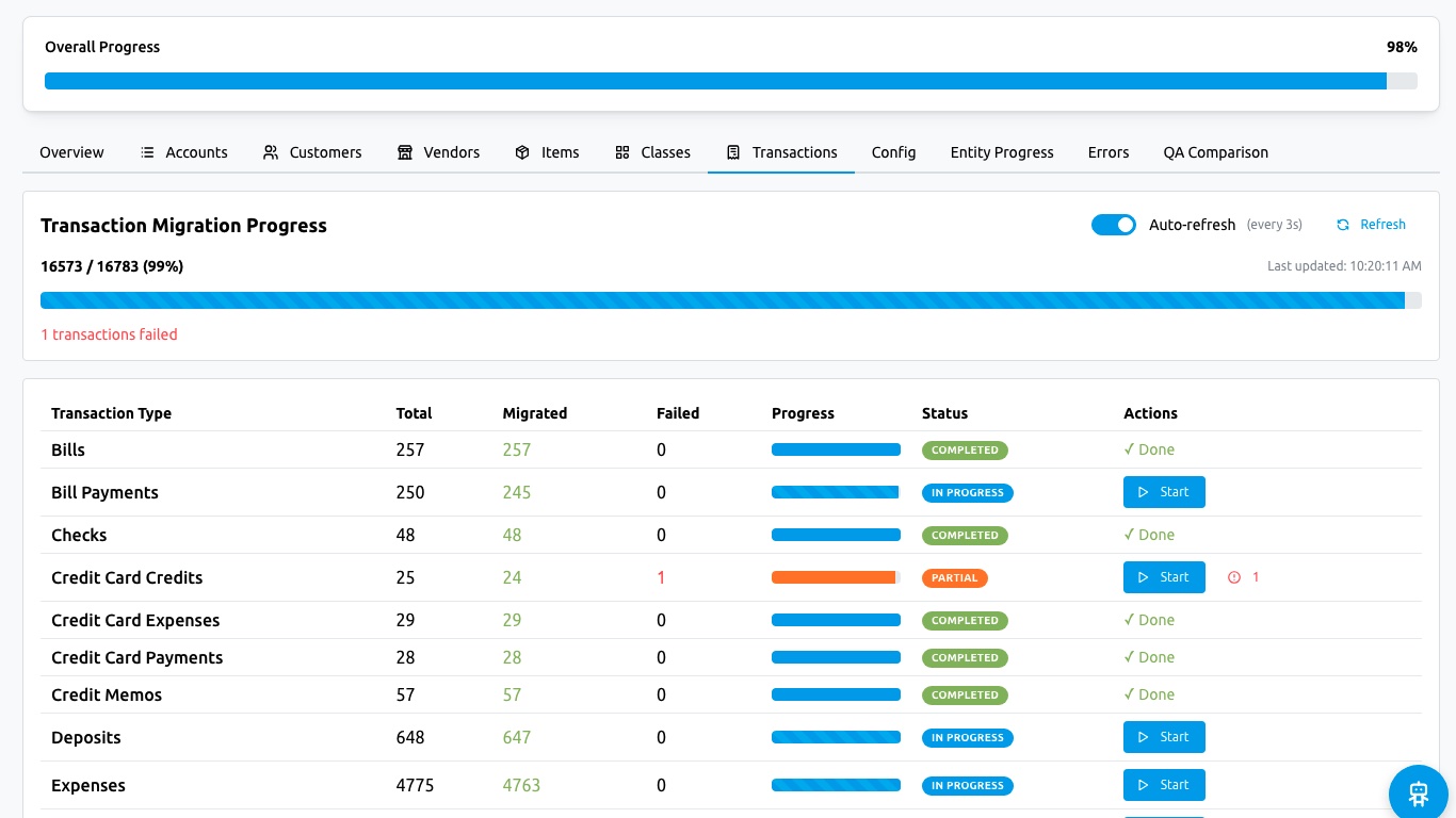 We transfer every transaction (invoices, bills, journals) using our proprietary engine.